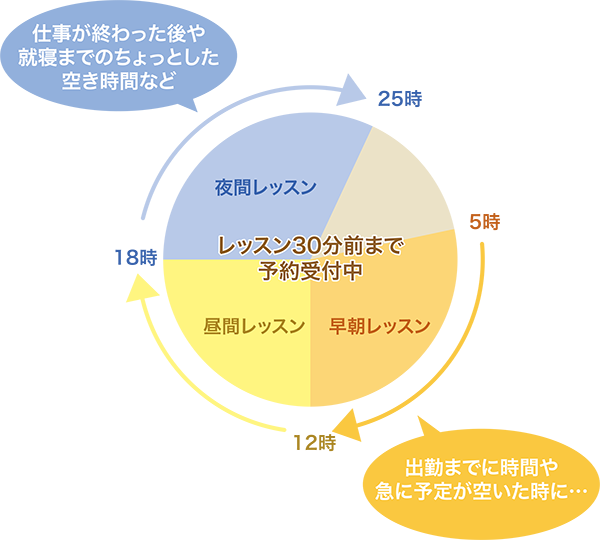 講師とレッスンの日時が決まったら、無料体験の予約をします。レッスン開始の30分前まで予約可能だから、忙しいビジネスマンにも役立ちます。